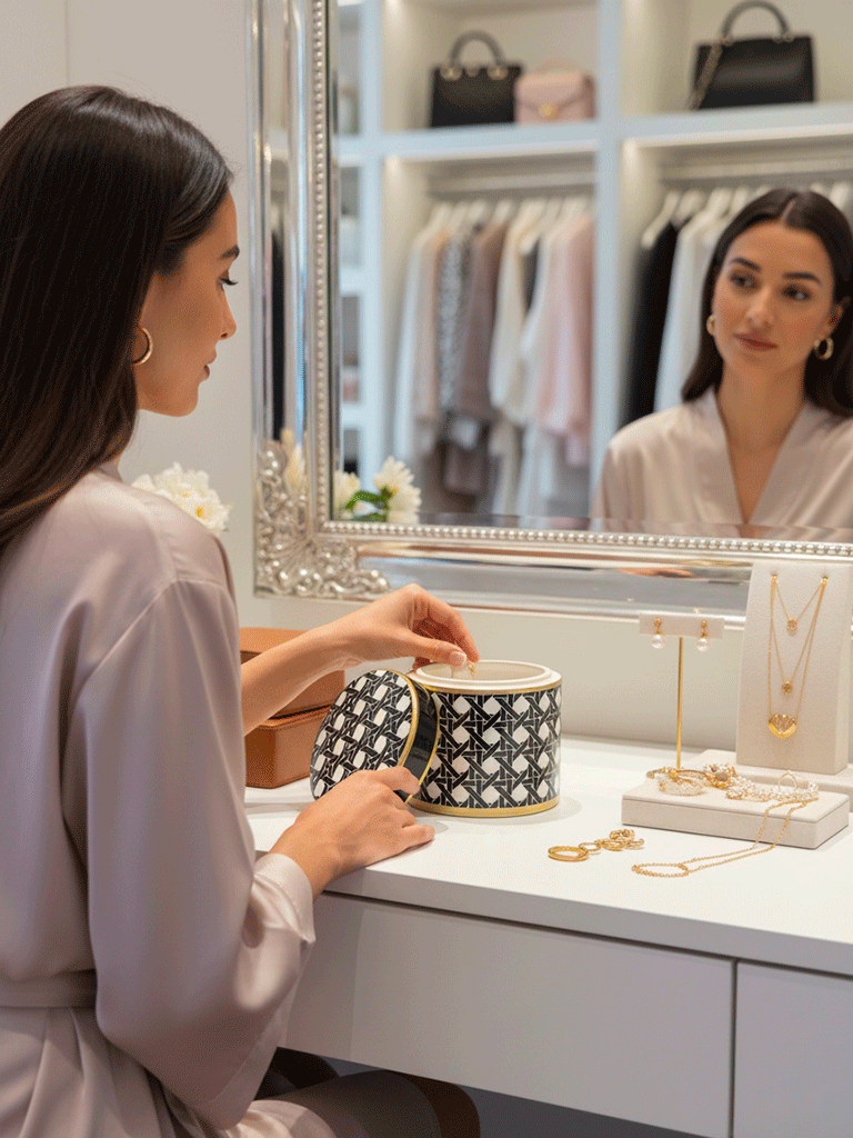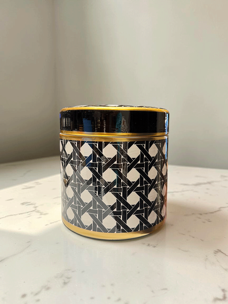 Cofanetto in ceramica con coperchio e motivo geometrico in bianco e nero con dettagli dorati. Ideale per custodire piccoli oggetti con stile moderno ed elegante.