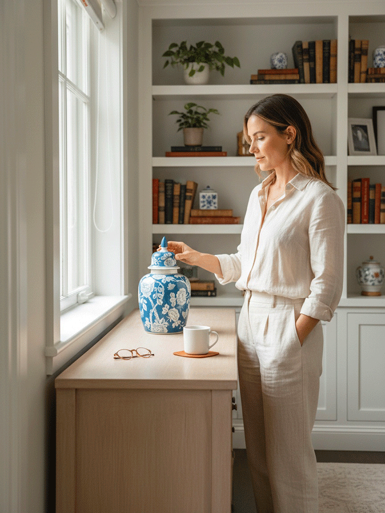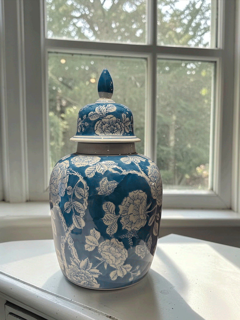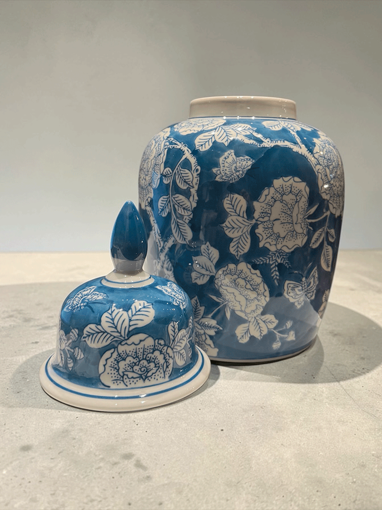 Potiche in ceramica con coperchio decorata con motivo floreale bianco su fondo blu. Un elemento d’arredo elegante e senza tempo, ideale per arricchire ambienti raffinati.