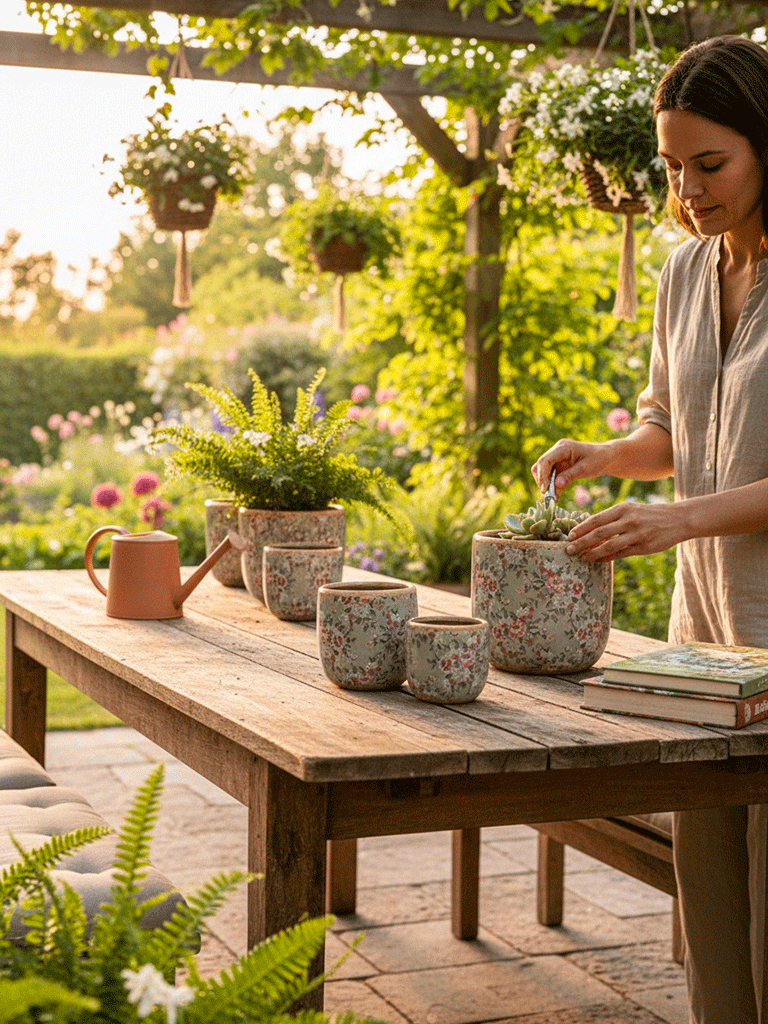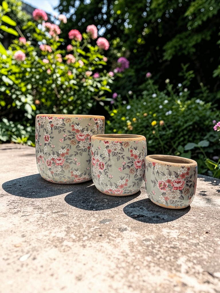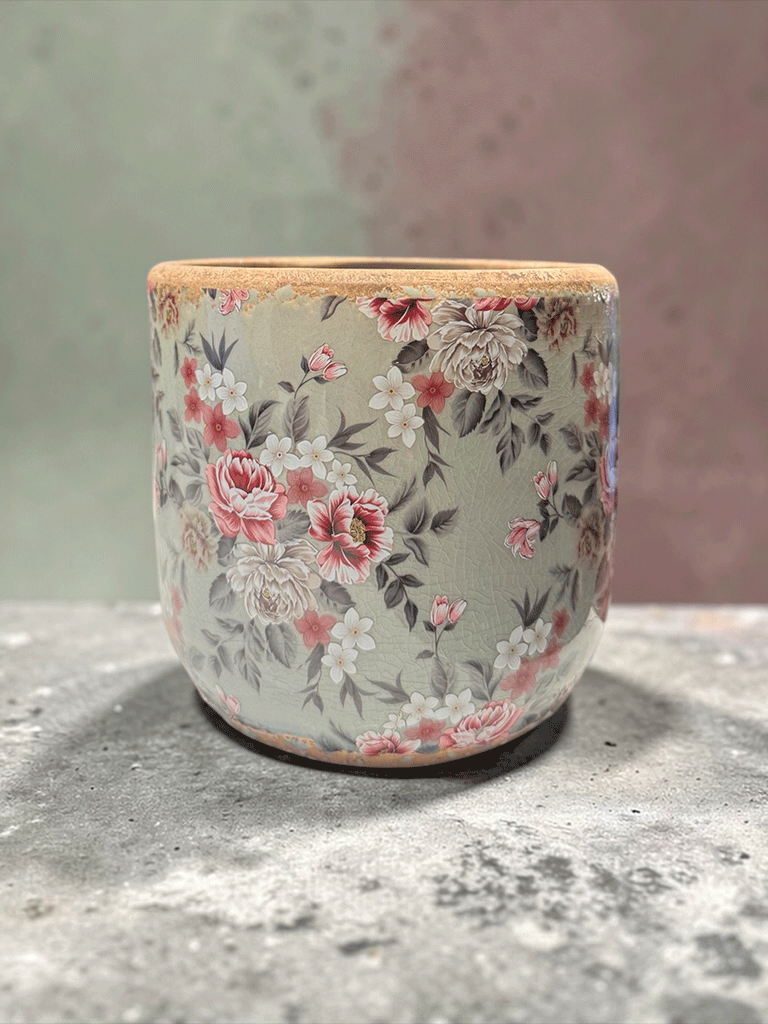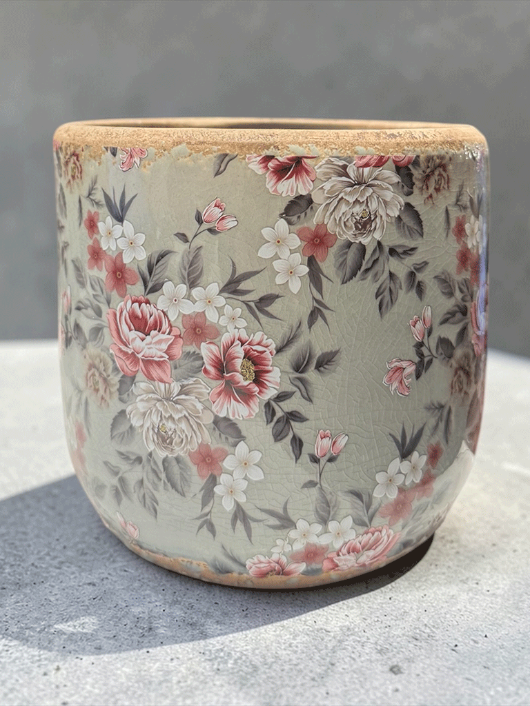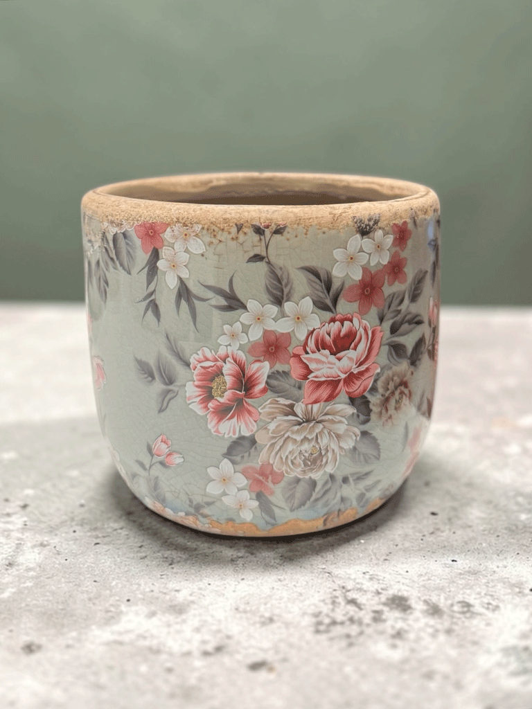 Vaso in ceramica con decorazione di fiori, i vari formati lo rendono adatto a diventare un contenitore per candele profumate o piante rigogliose.