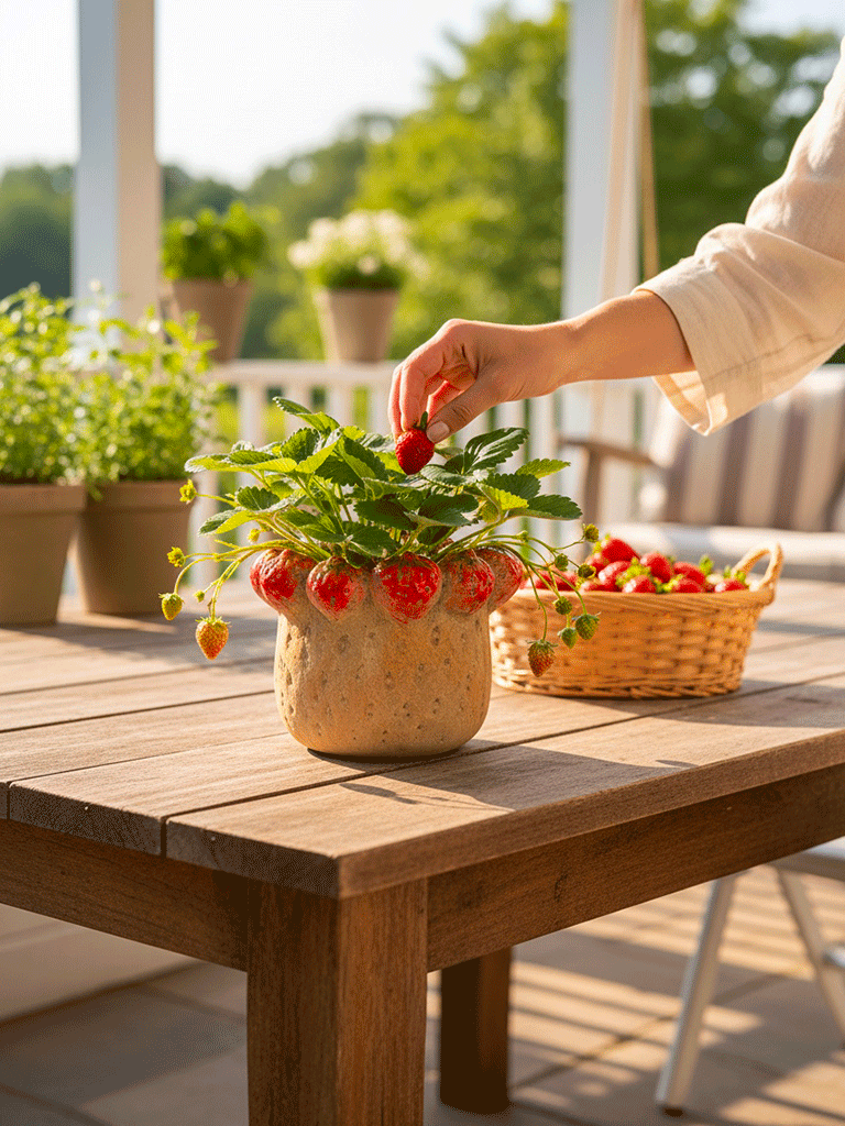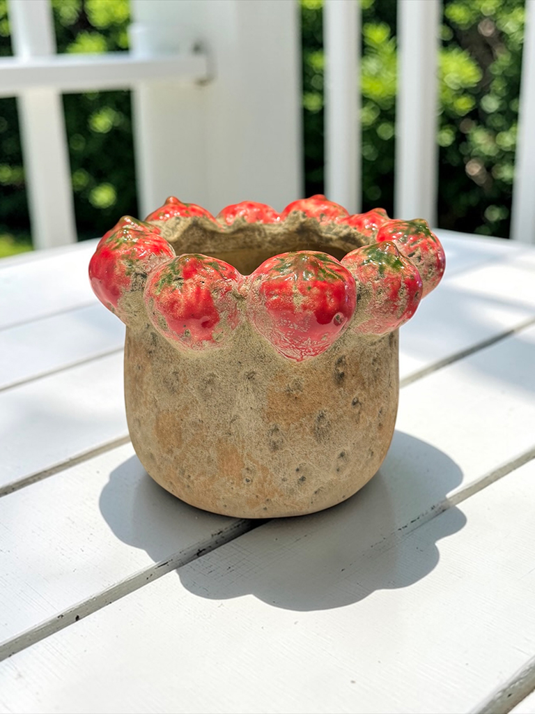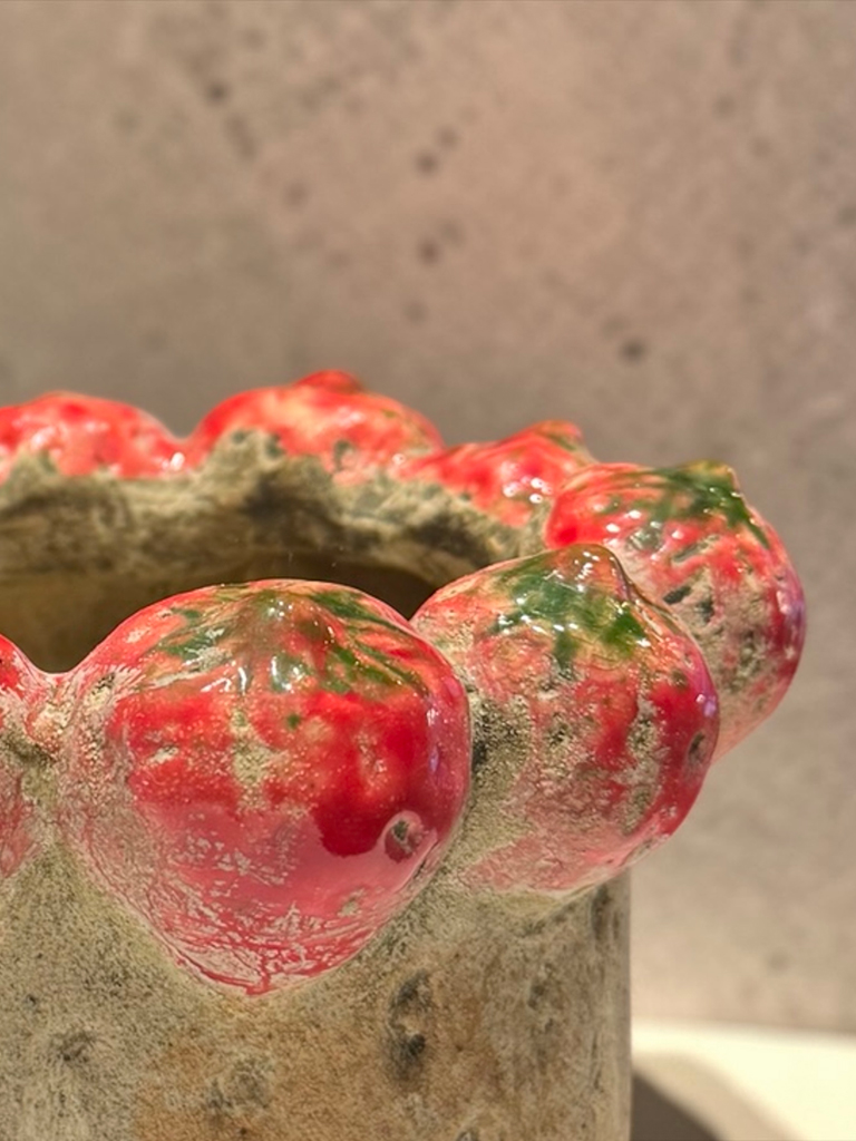 Vaso ceramica con fragole in rilievo e finitura materica. Un pezzo decorativo unico dallo stile rustico e cottage, ideale per piante o come originale idea regalo.